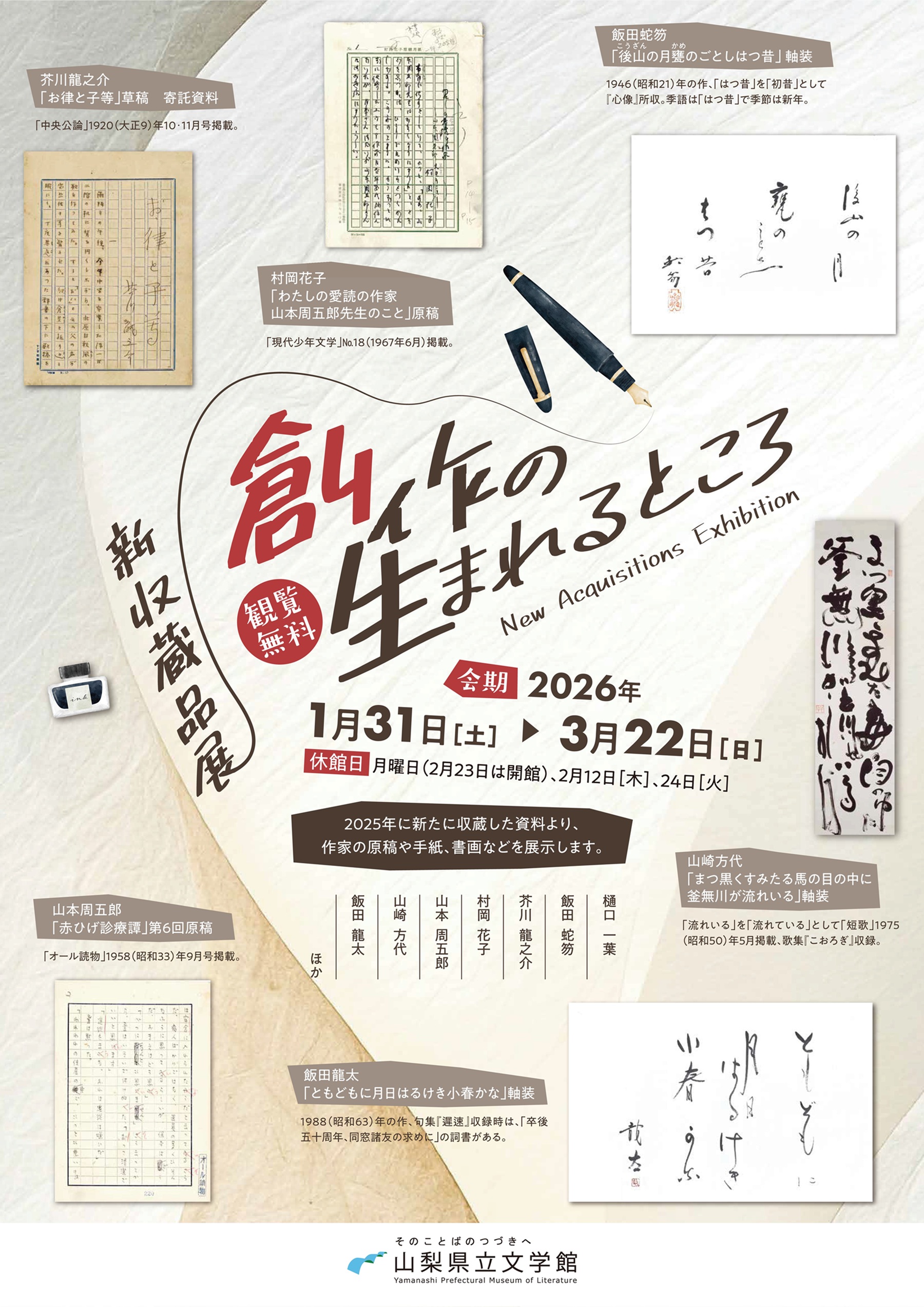 2025年に新たに収蔵した作家の原稿や手紙、書画など、約70点の資料をご覧いただけます。芥川龍之介の小説「お律と子等」草稿、村岡花子の随筆「わたしの愛読の作家 山本周五郎先生のこと」原稿、山本周五郎の小説「赤ひげ診療譚」第6回原稿、飯田蛇笏の「後山の月甕のごとしはつ昔」軸装、山崎方代が同郷の友に贈った書「まつ黒くすみたる馬の目の中に釜無川が流れいる」軸装、飯田龍太が同窓会の求めに応じて詠んだ句で、同級生に贈った書「ともどもに月日はるけき小春かな」軸装などをご覧いただけます。個性豊かな手書きの資料から、様々な作品が生み出されるところを想像してみてはいかがでしょうか。